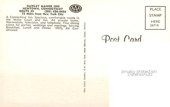 73333567 Newtown Connecticut Hawley Manor Inn Hotel Restaurant postalisch nicht gelaufen Erhaltung siehe scans [FriedD77] KatCode: 14140070000000