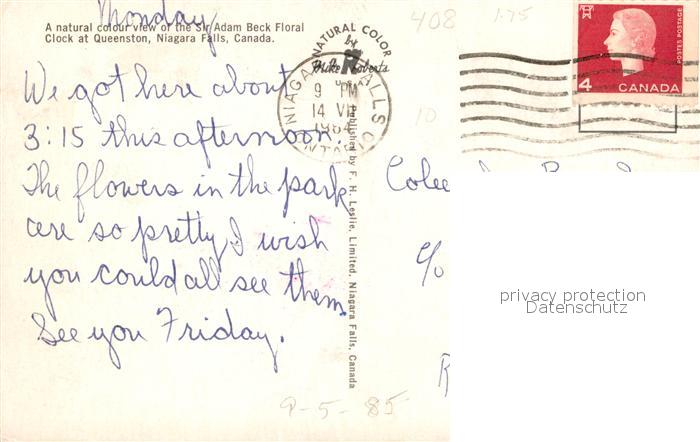 73130101 old postcard Niagara Falls New York Blumenuhr Sir Adam Beck postalisch gelaufen Erhaltung siehe scans [KathaD81] KatCode: 14140340000000