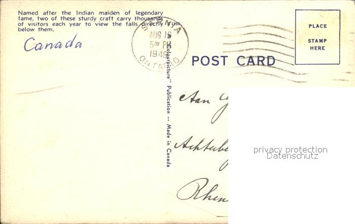 old postcard Niagara Falls Ontario Faelle mit Ausflugsdampfer postalisch gelaufen Erhaltung siehe scans