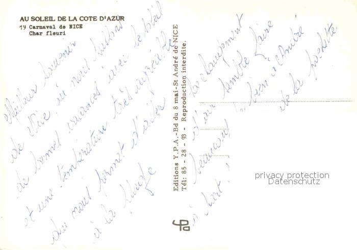12667951 Nice Alpes Maritimes Carnaval de Nice Char fleuri postalisch nicht gelaufen Erhaltung siehe scans [WerneD78] KatCode: 11170006206088