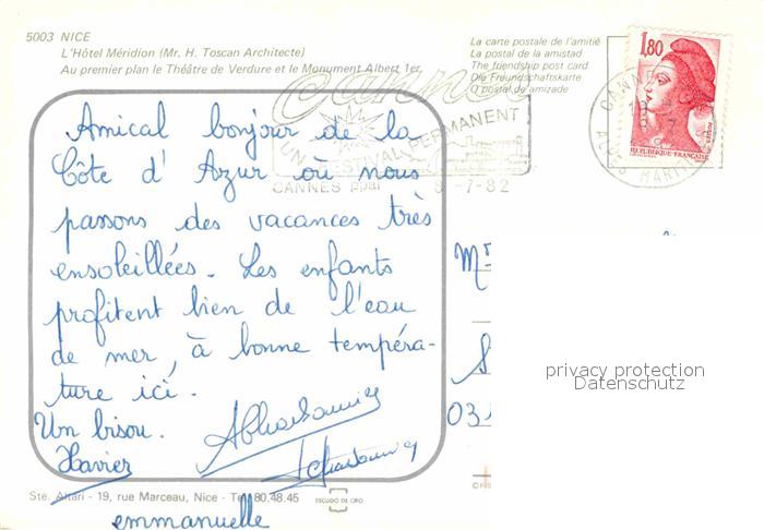 12872660 carte postale Nice Alpes Maritimes Hotel Meridion postalisch gelaufen Erhaltung siehe scans [LiesaD40] KatCode: 11170006206088