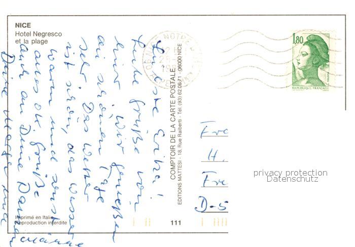 13364811 carte postale Nice Alpes Maritimes Hotel Negresco et la plage postalisch gelaufen Erhaltung siehe scans [WerneD78] KatCode: 11170006206088