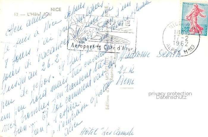 13356497 carte postale Nice Alpes Maritimes Hotel Ruhl postalisch gelaufen Erhaltung siehe scans [FriedD77] KatCode: 11170006206088
