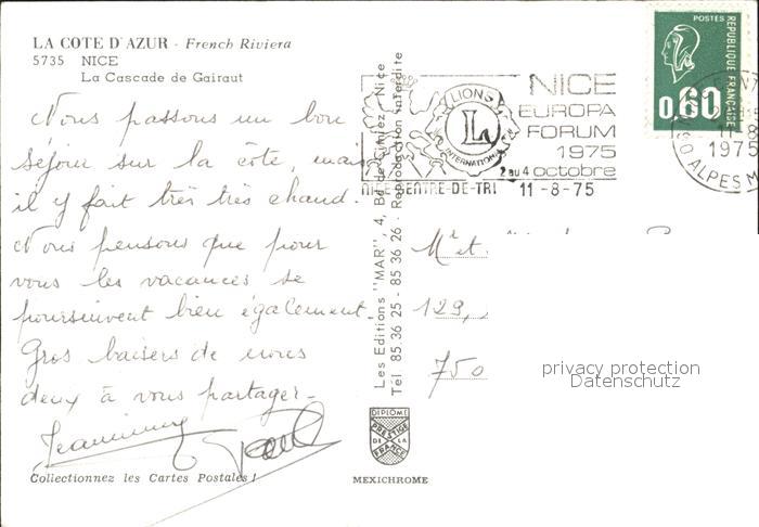12157632 carte postale Nice Alpes Maritimes La Cascade de Gairaut postalisch gelaufen Erhaltung siehe scans KatCode: 11170006206088