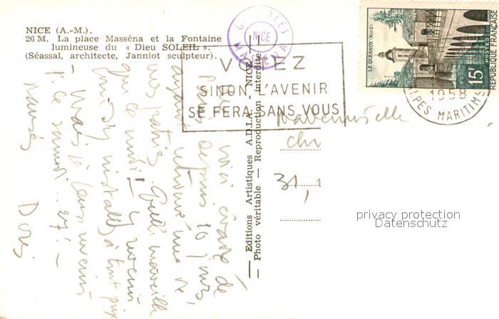 13583034 Nice Alpes Maritimes La place Massena et la Fontaine lumineuse du Dieu Soleil postalisch gelaufen Erhaltung siehe scans [WerneD78] carte postale Wern Katcode 11170006206088