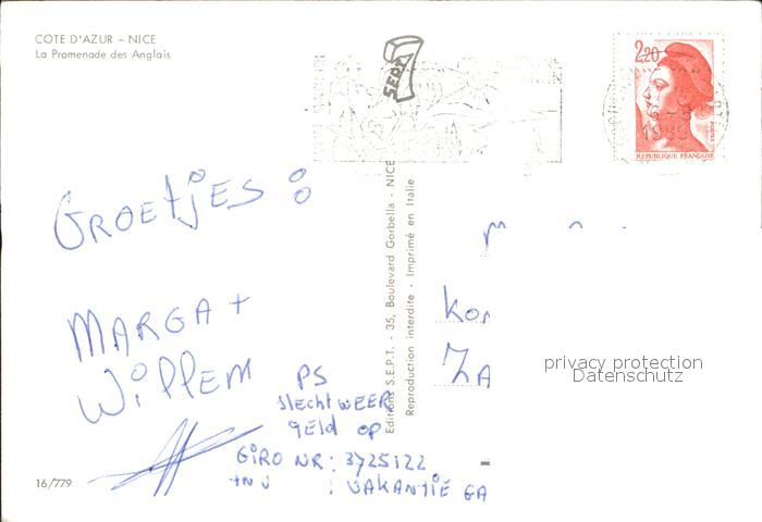 12324945 carte postale Nice Alpes Maritimes Promenade Anglais postalisch gelaufen Erhaltung siehe scans KatCode: 11170006206088