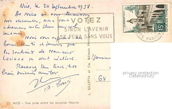 12686385 carte postale Nice Alpes Maritimes Vue prise entre les pergolas fleuries postalisch gelaufen Erhaltung siehe scans [FriedD77] KatCode: 11170006206088