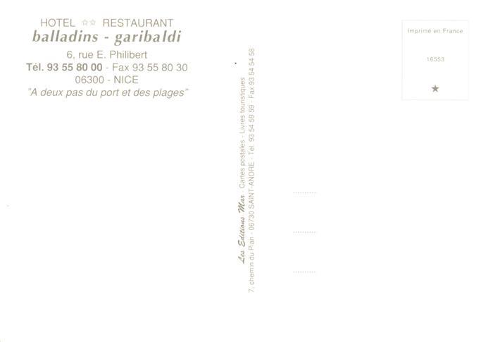 13944039 Nice Nizza 06 Alpes-Maritimes Hotel Restaurant Balladins Garibaldi A deux pas du port et des plages postalisch nicht gelaufen Erhaltung siehe scans [WerneD78] Wern Katcode 11170006206088