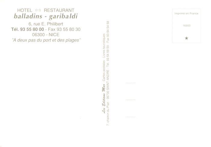 13944041 Nice Nizza 06 Alpes-Maritimes Hotel Restaurant Balladins Garibaldi A deux pas du port et des plages postalisch nicht gelaufen Erhaltung siehe scans [WerneD78] Wern Katcode 11170006206088