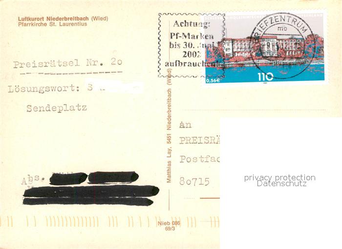 73226529 alte Postkarte Niederbreitbach Pfarrkirche St. Lautentius postalisch gelaufen Erhaltung siehe scans [LiesaD40] KatCode: 11110007138047