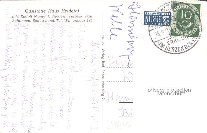 31706029 alte Postkarte Niederhaverbeck Gasthaus Heidetal Naturschutzpark Lueneburger Heide postalisch gelaufen Erhaltung siehe scans KatCode: 11110003358002