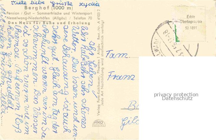74096871 alte Postkarte Niederhoefen Nesselwang Bayern Allgaeu Pension Berghof postalisch gelaufen Erhaltung siehe scans [FriedD77] KatCode: 11110009777153