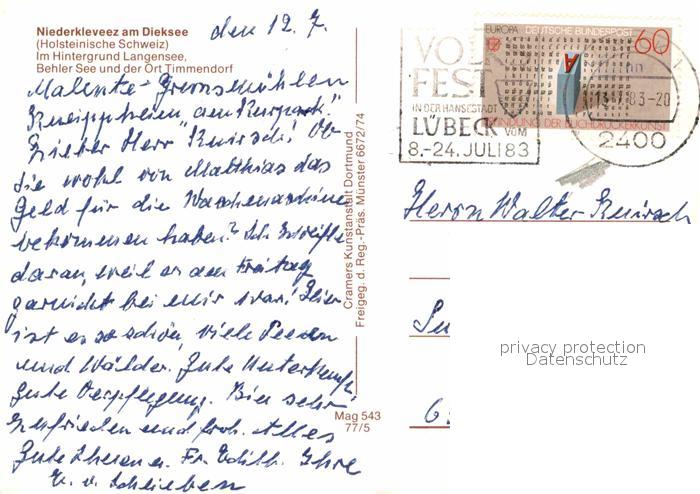 72771985 alte Postkarte Niederkleveez Fliegeraufnahme mit Dieksee Langensee Behler-See Timmendorf postalisch gelaufen Erhaltung siehe scans [LiesaD40] KatCode: 11110001057009