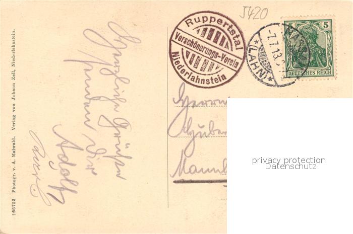 73557148 alte Postkarte Niederlahnstein Partie aus dem Ruppertstal postalisch gelaufen Erhaltung siehe scans [PaolaD17] KatCode: 11110007141075