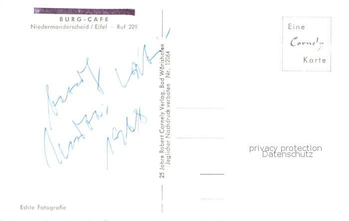 73832467 Niedermanderscheid Eifel Burg-Cafe Gastraum Zeichnung Kuenstlerkarte postalisch nicht gelaufen Erhaltung siehe scans [FriedD77] KatCode: 11110007231080