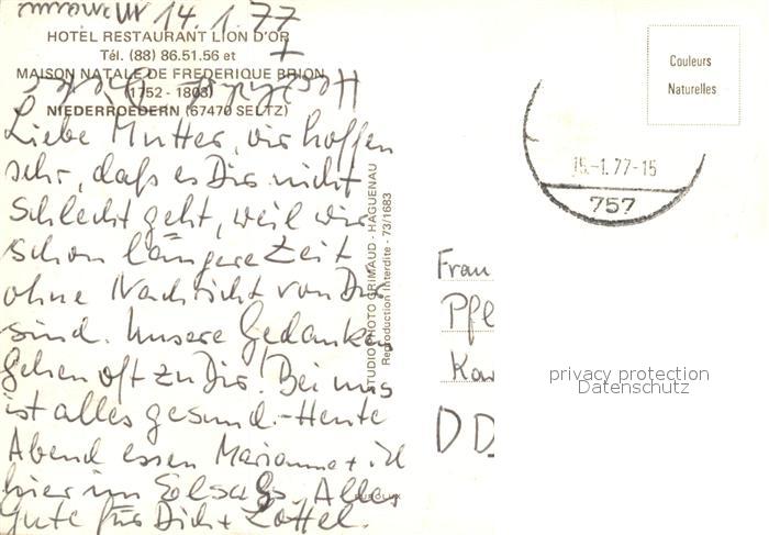 13221852 carte postale Niederroedern Hotel Restaurant Lion d Or postalisch gelaufen Erhaltung siehe scans [FriedD77] KatCode: 11170067767330