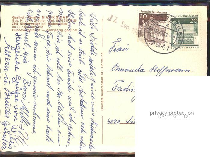 71848667 alte Postkarte Niederweiler Muellheim Gasthof-Pension Markgraf postalisch gelaufen Erhaltung siehe scans KatCode: 11110008315074