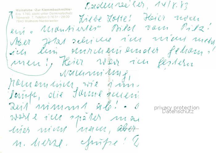 72631356 Niederweiler Muellheim Weinstube zur Klemmbachmuehle postalisch nicht gelaufen Erhaltung siehe scans [LiesaD40] KatCode: 11110008315074