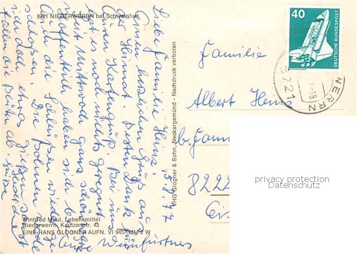 73852602 alte Postkarte Niederwerrn Schule Kirchen Lebensmittelgeschaeft Maul postalisch gelaufen Erhaltung siehe scans [WerneD78] KatCode: 11110009678160
