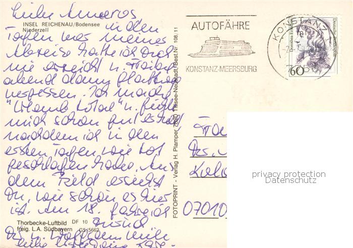 73779750 alte Postkarte Niederzell Reichenau Fliegeraufnahme postalisch gelaufen Erhaltung siehe scans [WerneD78] KatCode: 11110008335066