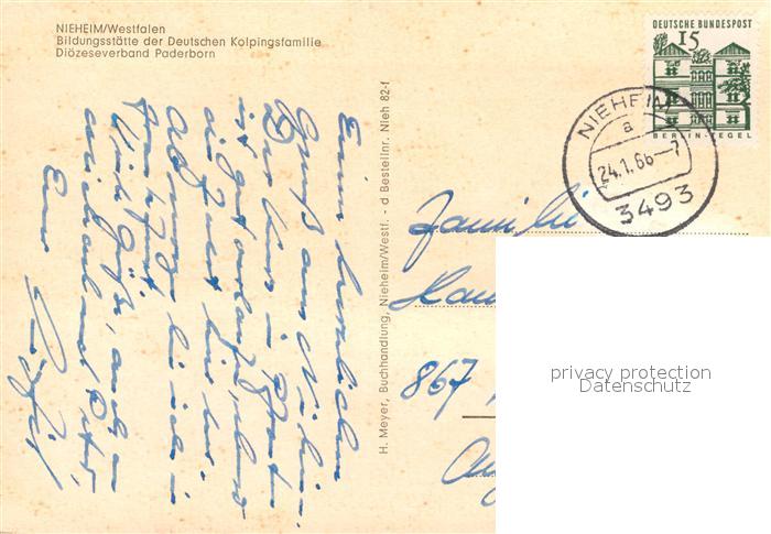 73167302 alte Postkarte Nieheim Bildungsstaette der Deutschen Kolpingsfamilie Dioezeseverband Paderborn postalisch gelaufen Erhaltung siehe scans [FriedD77] KatCode: 11110005762028