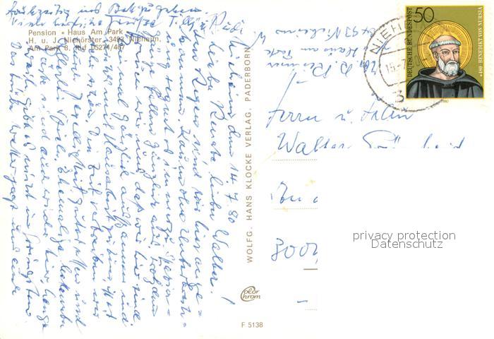 73662589 alte Postkarte Nieheim Pension Haus Am Park Gaststube Fremdenzimmer postalisch gelaufen Erhaltung siehe scans [FriedD77] KatCode: 11110005762028