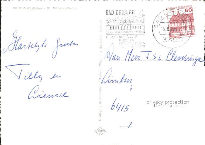 72470970 alte Postkarte Nieheim St. Nikolaus-Kirche postalisch gelaufen Erhaltung siehe scans KatCode: 11110005762028