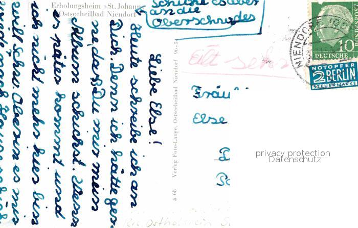 72786766 alte Postkarte Niendorf Ostseebad Erholungsheim St Johann postalisch gelaufen Erhaltung siehe scans [FriedD77] KatCode: 11110001055042