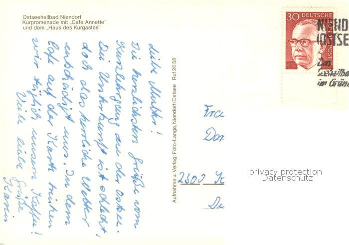 73758767 alte Postkarte Niendorf Ostseebad Timmendorferstrand Kurpromenade Cafe-Annette Haus-des-Kurgastes postalisch gelaufen Erhaltung siehe scans [LiesaD40] KatCode: 11110001055042