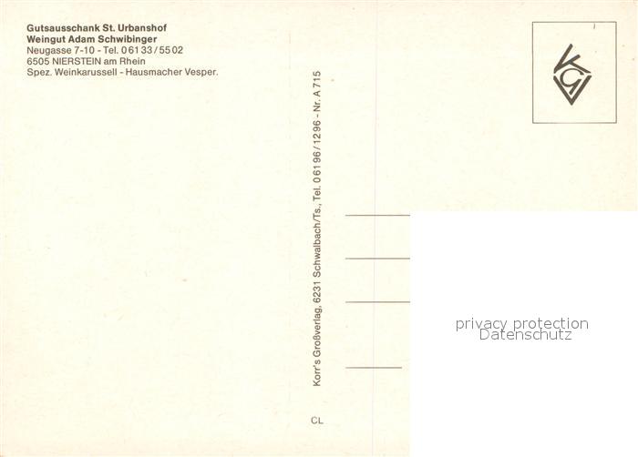 73726348 Nierstein Rhein Gutsausschank St. Urbanshof Weingut Schwibinger postalisch nicht gelaufen Erhaltung siehe scans [FriedD77] KatCode: 11110007339043