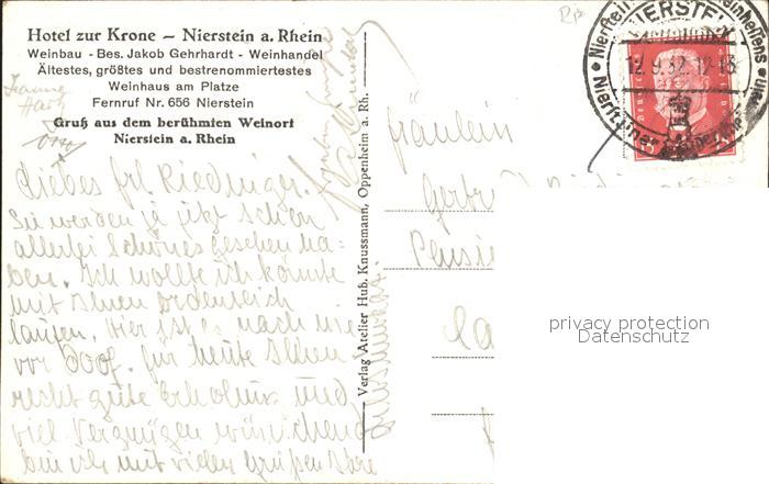32180666 alte Postkarte Nierstein Rhein Hotel zur Krone postalisch gelaufen Erhaltung siehe scans KatCode: 11110007339043
