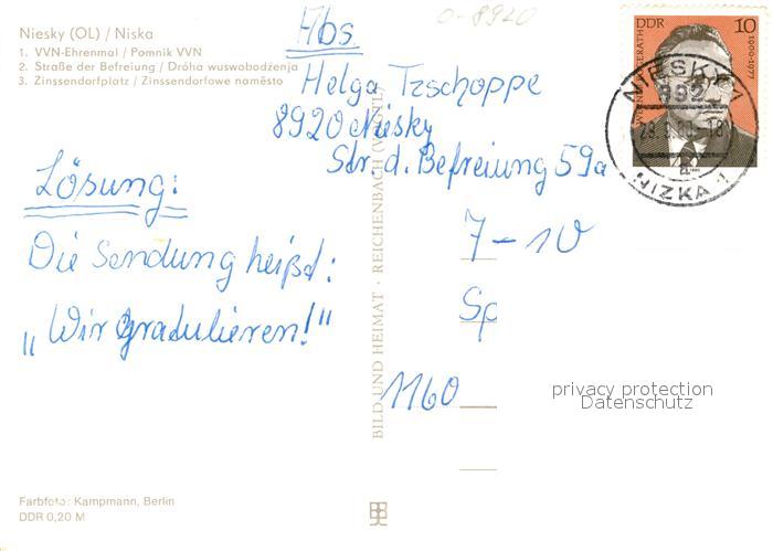 73039804 alte Postkarte Niesky VVN Ehrenmal Strasse der Befreiung Zinssendorfplatz postalisch gelaufen Erhaltung siehe scans [WerneD78] KatCode: 11110014284280