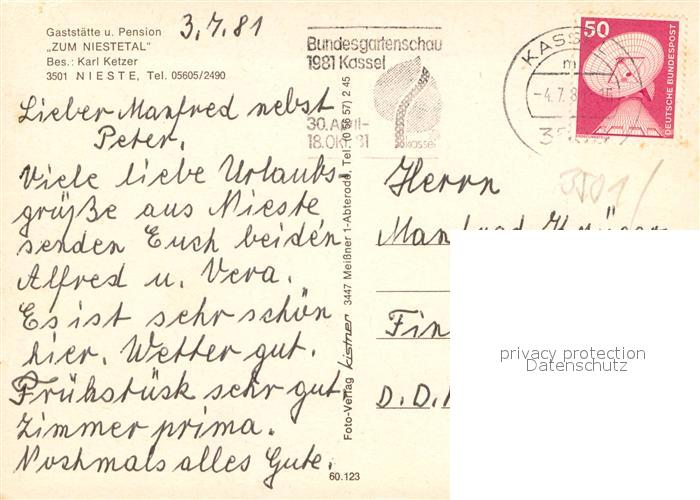73654219 alte Postkarte Nieste Gaststaette Pension Zum Niestetal Gastraum Fachwerkhaus Panorama postalisch gelaufen Erhaltung siehe scans [FriedD77] KatCode: 11110006633019