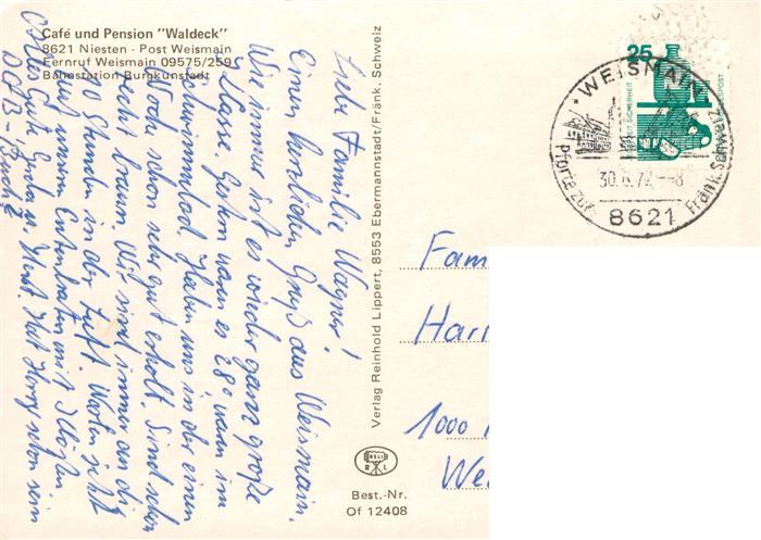 73878229 alte Postkarte Niesten Weismain Cafe Pension Waldeck Gastraum Terrasse postalisch gelaufen Erhaltung siehe scans [FriedD77] KatCode: 11110009478176