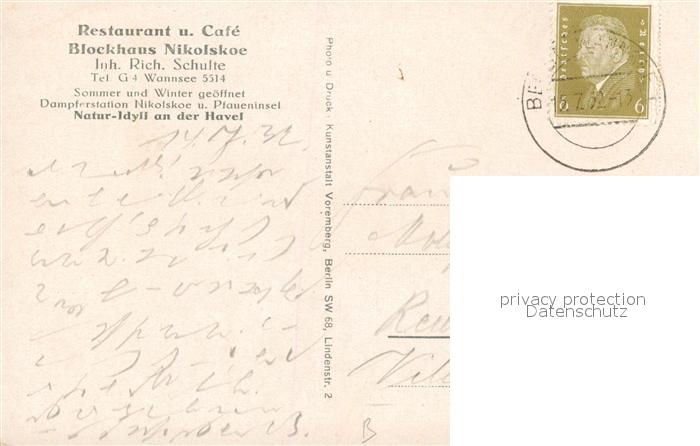 43368089 alte Postkarte Nikolskoe Berlin Ausblick vom Restaurant Blockhaus auf die Havel postalisch gelaufen Erhaltung siehe scans [FriedD77] KatCode: 11110011000000