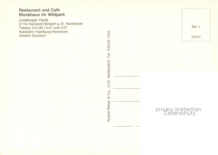 73167262 Nindorf Nordheide Restaurant Cafe Blockhaus im Wildpark Lueneburger Heide postalisch nicht gelaufen Erhaltung siehe scans [FriedD77] KatCode: 11110003353016