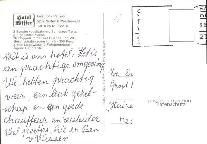 72237154 alte Postkarte Nistertal Westerwald Hotel Wisser Pension mit Pferdewagen postalisch gelaufen Erhaltung siehe scans KatCode: 11110007143279