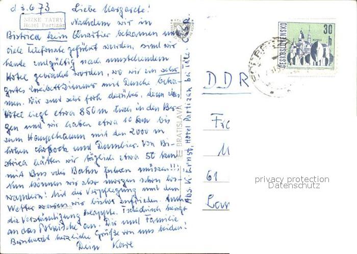 old postcard Nizke Tatry Hotel Partizan postalisch gelaufen Erhaltung siehe scans