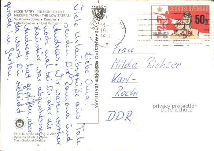 old postcard Nizke Tatry Hotel Partizan postalisch gelaufen Erhaltung siehe scans