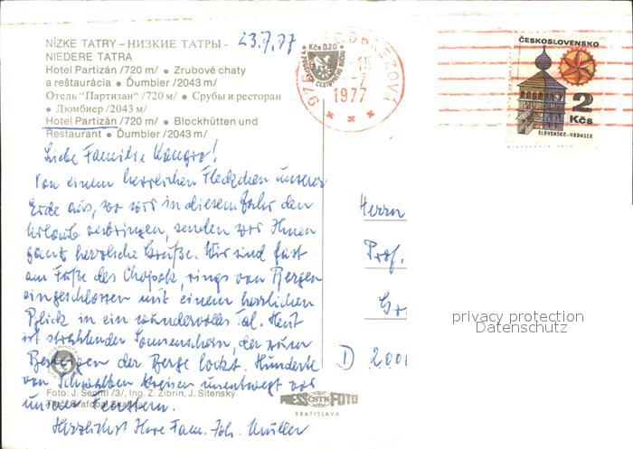 old postcard Nizke Tatry Hotel Partizan postalisch gelaufen Erhaltung siehe scans