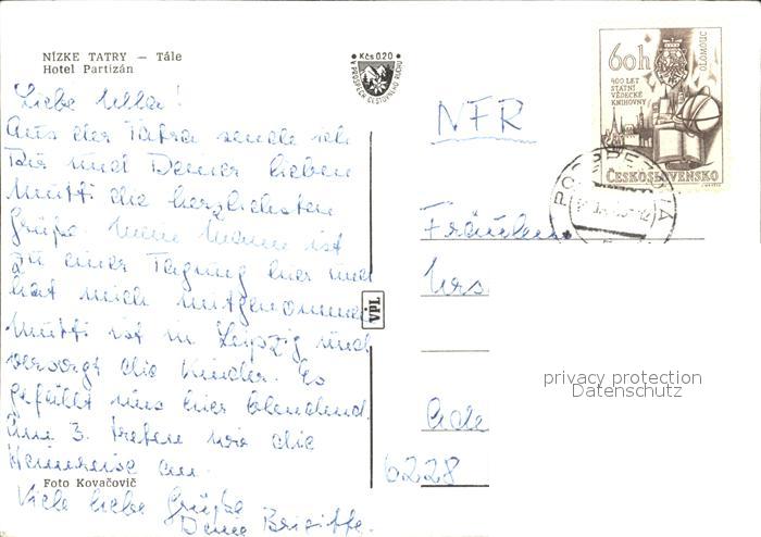 old postcard Nizke Tatry Tale Hotel Partizan postalisch gelaufen Erhaltung siehe scans