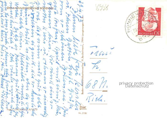 Nonnenhorn Gesamtansicht mit Alpen Luftaufnahme Strandbad Bodensee Seegfoerne Gedenkstein Kirche St. Christophorus Alte Torkel-Presse postalisch gelaufen Erhaltung siehe scans [FriedD77] alte Postkarte Frie Katcode 11110009776120