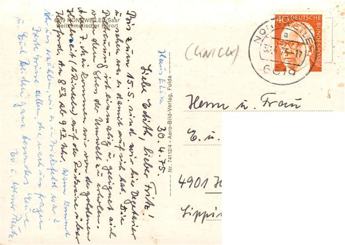 73871747 alte Postkarte Nonnweiler-Primstal Saarland Blick zur Kirche Schule Kurhalle Hallenbad postalisch gelaufen Erhaltung siehe scans [FriedD77] KatCode: 11110010046115