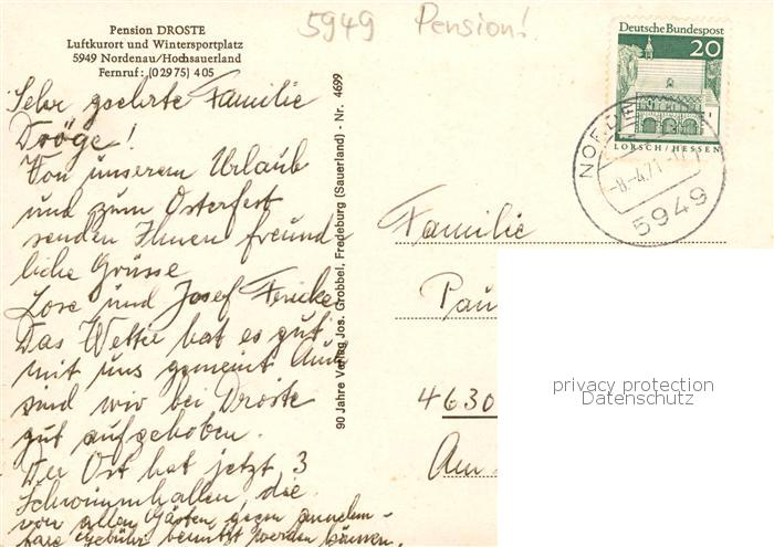 73864189 alte Postkarte Nordenau Schmallenberg Pension Droste Terrasse Gaststube postalisch gelaufen Erhaltung siehe scans [WerneD78] KatCode: 11110005958040