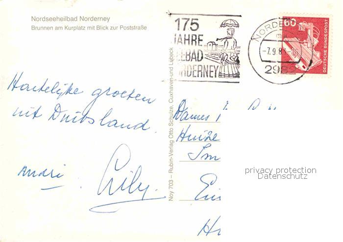 72787892 alte Postkarte Norderney Nordseebad Brunnen am Kurplatz Blick zur Poststrasse postalisch gelaufen Erhaltung siehe scans [FriedD77] KatCode: 11110003452020