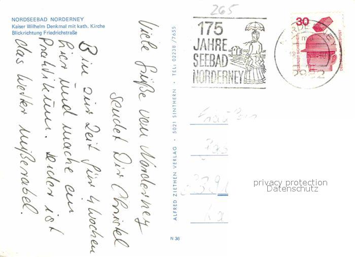 72670199 alte Postkarte Norderney Nordseebad Kaiser Wilhelm Denkmal Friedrichstrasse Strand postalisch gelaufen Erhaltung siehe scans [LiesaD40] KatCode: 11110003452020