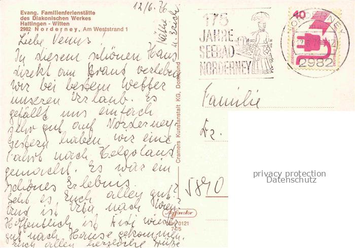 74156671 alte Postkarte NORDERNEY Nordseebad Niedersachsen Strand Strandkoerbe Weststrand Diakonisches-Werk Familienferienstaette Strandpromenade Badeort Nordsee postalisch gelaufen Erhaltung siehe scans [Karloger] KatCode: 11110003452020