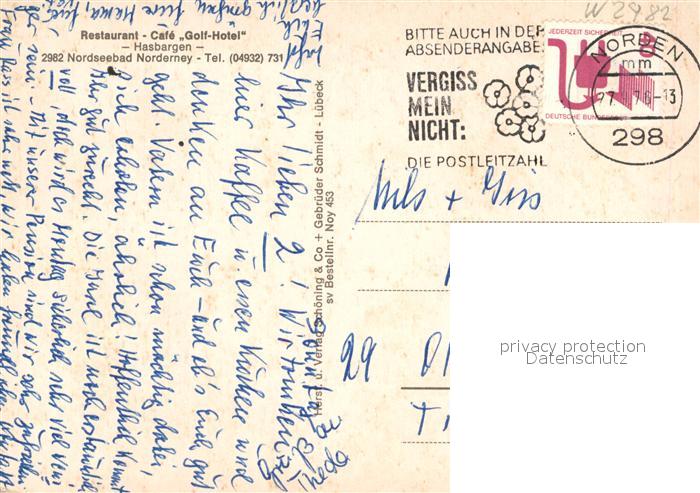 73111897 alte Postkarte Norderney Nordseebad Restaurant Golf-Hotel Hasbargen postalisch gelaufen Erhaltung siehe scans [NatalD47] KatCode: 11110003452020