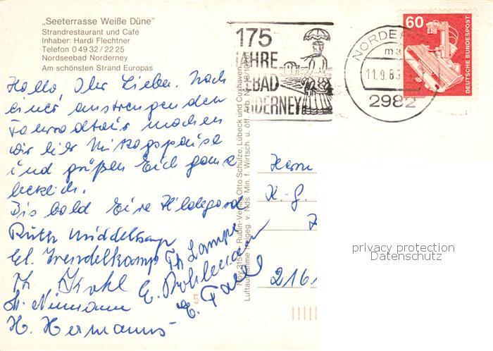 73858785 alte Postkarte Norderney Nordseebad Seeterrasse Weisse Duene Strandrestaurant Cafe postalisch gelaufen Erhaltung siehe scans [FriedD77] KatCode: 11110003452020
