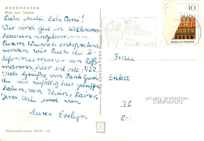 73136756 alte Postkarte Nordhausen Thueringen Blick zum Theater postalisch gelaufen Erhaltung siehe scans [FriedD77] KatCode: 11110016062041